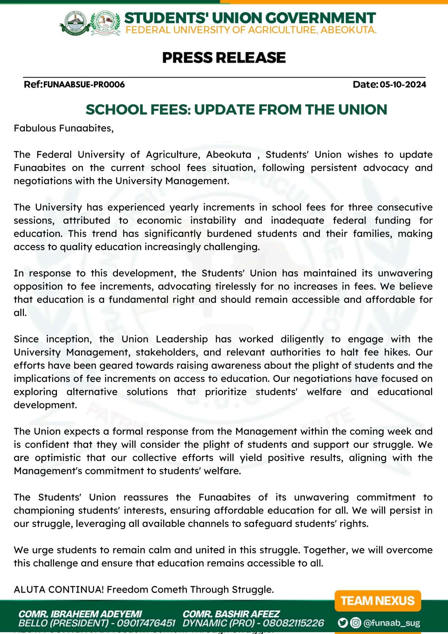The Students’ Union, Federal University of Agriculture, Abeokuta (FUNAAB), provides an update on the ongoing situation regarding school fees.