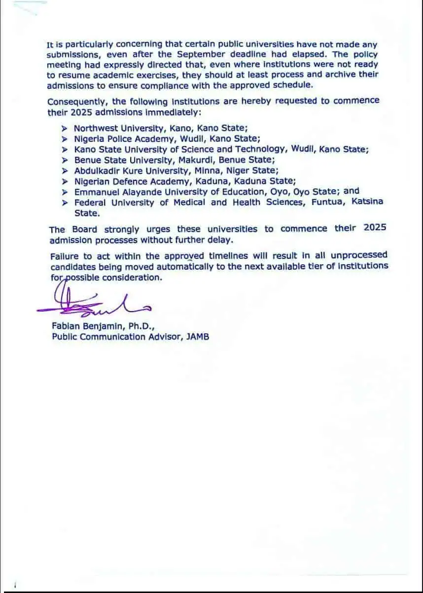 According to the resolution, all public universities must complete and forward their lists of qualified candidates who chose them as their first choice to the Joint Admissions and Matriculation Board (JAMB) no later than Tuesday, 30 September 2025.