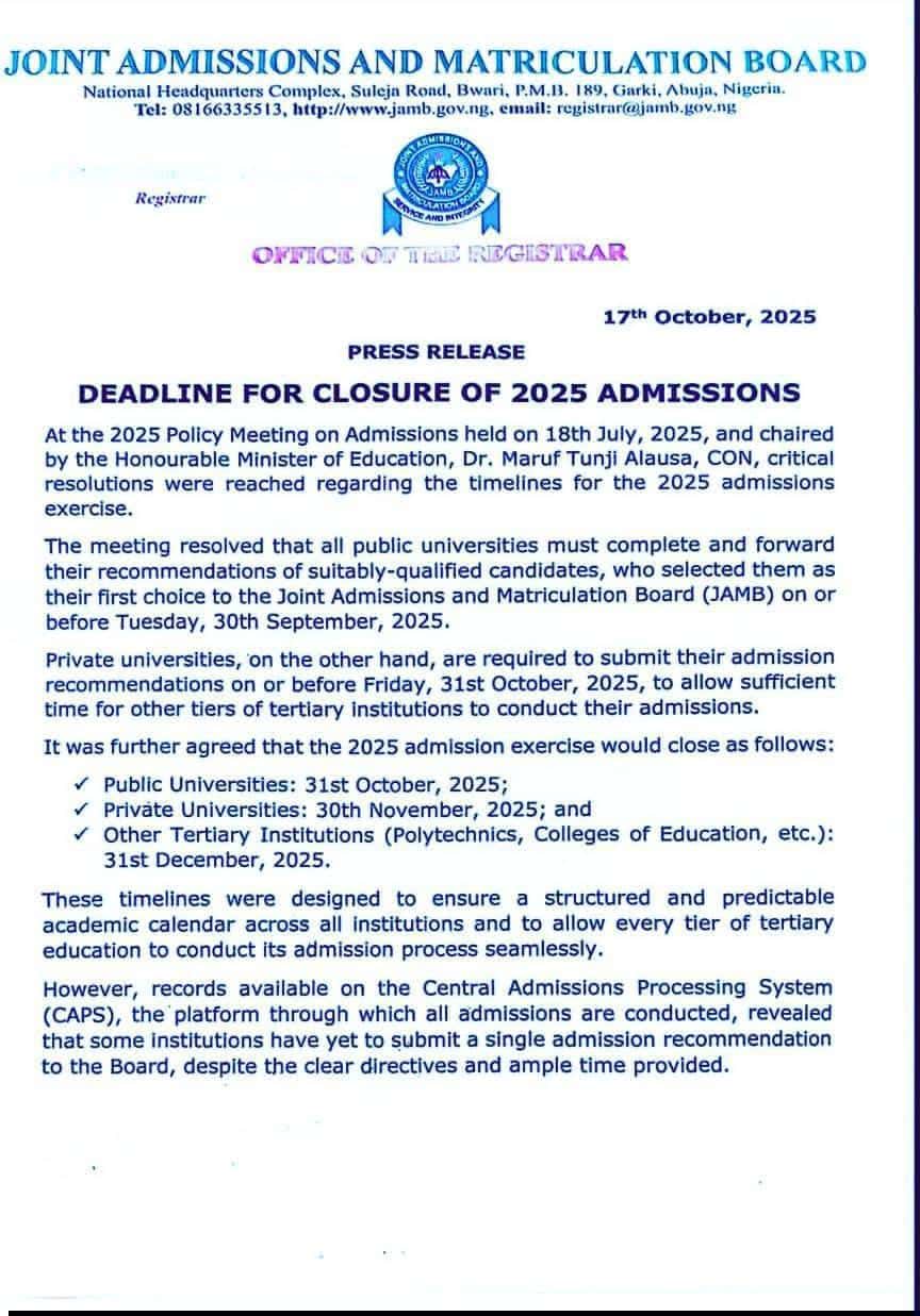 JAMB 2025 Admission Deadline for Tertiary Institutions
